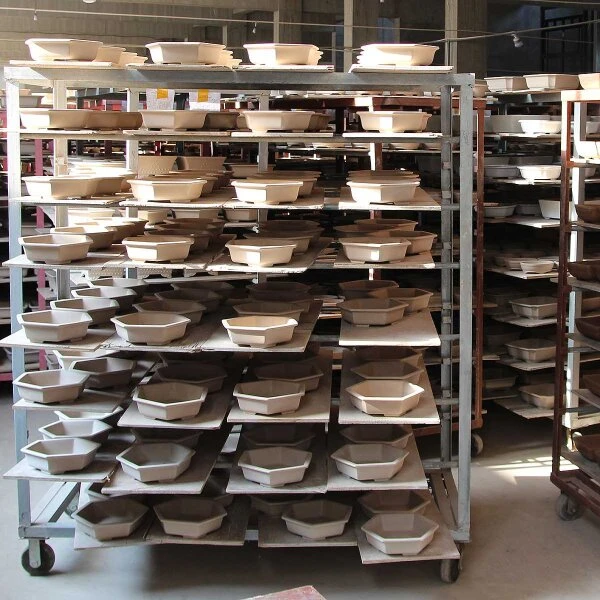 Herstellungsverfahren: Flüssiger Ton wird in eine Gipsform gepresst. Dadurch entsteht ein sehr akurater Grundkörper, der nach dem Trocknen im Gasofen bei ca. 1150-1200°C gebrannt wird.
