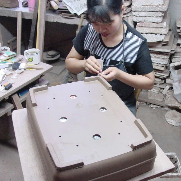 Löcher zur Fixierung des Wurzelballens mit Bonsaidraht: Vorhanden. Die Fixierung des Wurzelballens mit Bonsaidraht ist sehr wichtig um ein gutes Anwachsen des Bonsai nach dem Umtopfen zu gewährleisten.