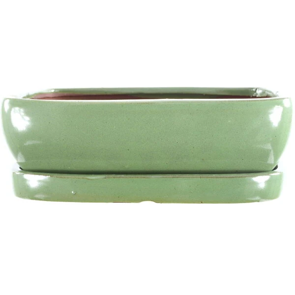 Bonsaischale mit Untersetzer (glasiert, hellgrün, rechteckig) in den Abmessungen: 24.5cm Länge, 19.5cm Breite, 8cm Höhe. Gute Standardqualität aus der Töpferstadt Yixing.