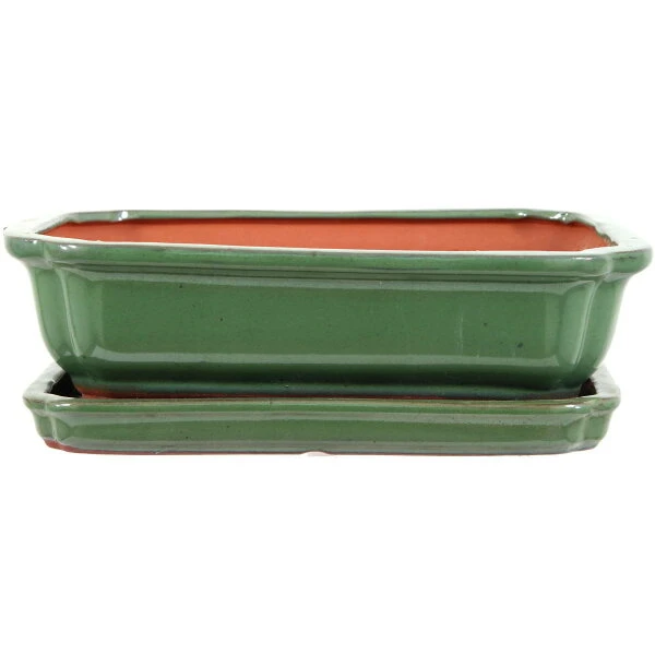Bonsaischale mit Untersetzer (glasiert, grün, rechteckig) in den Abmessungen: 26.5cm Länge, 21cm Breite, 7.5cm Höhe. Gute Standardqualität aus der Töpferstadt Yixing.